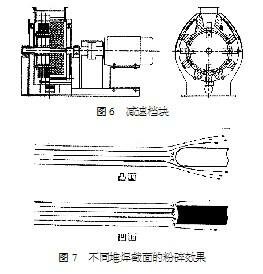 锤片的端部形状直接影响粉碎效果。为了提高耐磨性,一般在锤片端部采用碳化钨堆焊,由于堆焊工艺不当,堆焊后其截面呈圆形(见图7),严重影响粉碎效率,国内几乎都是圆形堆焊工艺,美国30年前碳化钨堆焊的锤片截面就呈方角或凹面(见图7),该截面既提高锤片的耐磨性,又提高粉碎效率。