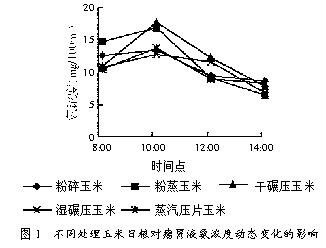 从表2可见,饲喂前各处理组间氨浓度有差异,粉蒸玉米日粮组瘤胃液氨浓度显著高于干碾压、湿碾压与蒸汽压片玉米日粮组(P<0.05);而与粉碎玉米日粮组间差异不大(P>0.05)。饲喂后各处理组间瘤胃液氨浓度差异不显著(P>0.05)。从平均数上看,干碾压玉米>粉蒸玉米>粉碎玉米>湿碾压玉米>蒸汽压片玉米日粮(见图1)。