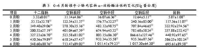 2.2 0~6月龄犊牛小肠α-淀粉酶活性变化(见表3)