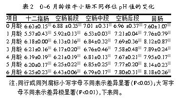 2.1 0~6月龄犊牛小肠不同部位pH值的变化(见表2)